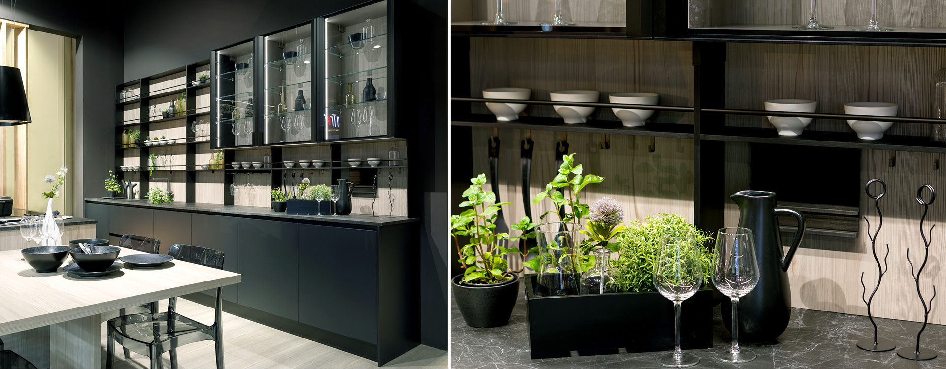 Antracitul mat lacuit este combinat cu culoarea lemnului in apele cenușii, în timp ce ferestrele metalice dau senzatia de bar pentru vin elegant, oferind dinamism spațiului.